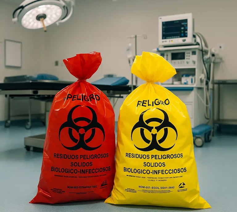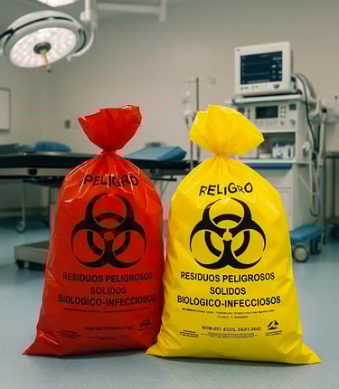 Ofrecemos bolsas RPBI rojas y amarillas de uso hospitalario, fabricadas en polietileno de alta resistencia y libres de metales pesados, ideales para el manejo y recolección segura de residuos biológico-infecciosos, cumpliendo con los lineamientos de la NOM-087-SEMARNAT-SSA1.