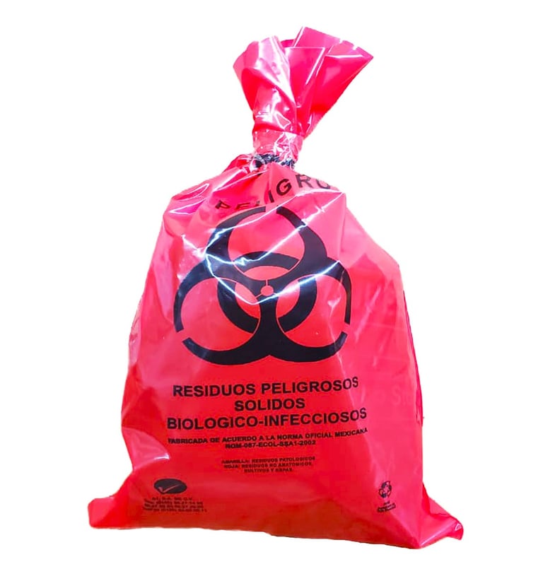 Su uso es obligatorio en hospitales y centros de salud según la NOM-087, y deben ser rojas o amarillas, resistentes, con impresión del símbolo de riesgo biológico.